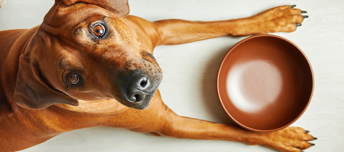 Ein Hund sitzt vor seinem leeren Napf und schaut erwartungsvoll nach oben.