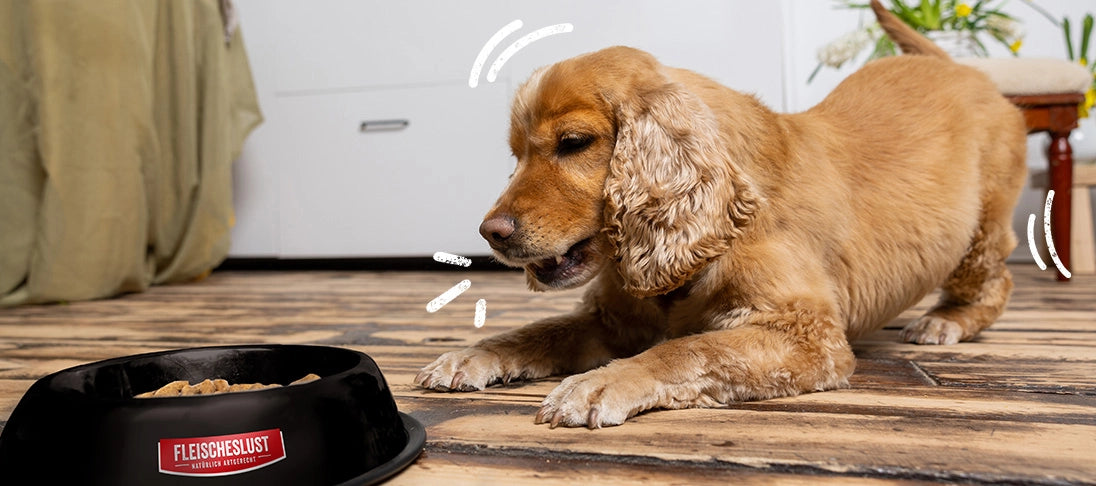 Ein Hund liegt freudig vor einem Napf mit Futter.