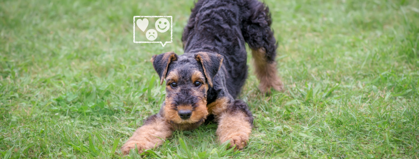 Ein kleiner freundlicher Hund fordert aufgeregt zum Spielen auf.