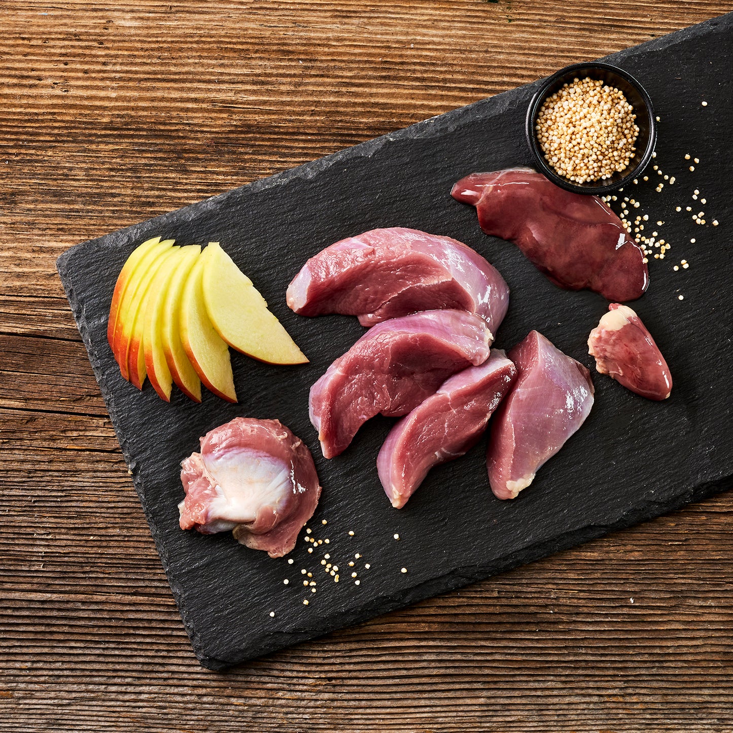 Our Pure Duck with Apple & Amaranth consists of 75% of the finest duck meat and offal and has only one source of animal protein, single carbohydrates and a reduced fat content. The selected, easily digestible ingredients are particularly suitable for dogs with sensitive diets. 10% fruit and crunchy fresh vegetables, supplemented with high-quality linseed oil rich in omega-3 fatty acids, make our sensitive complete food menu naturally species-appropriate.
