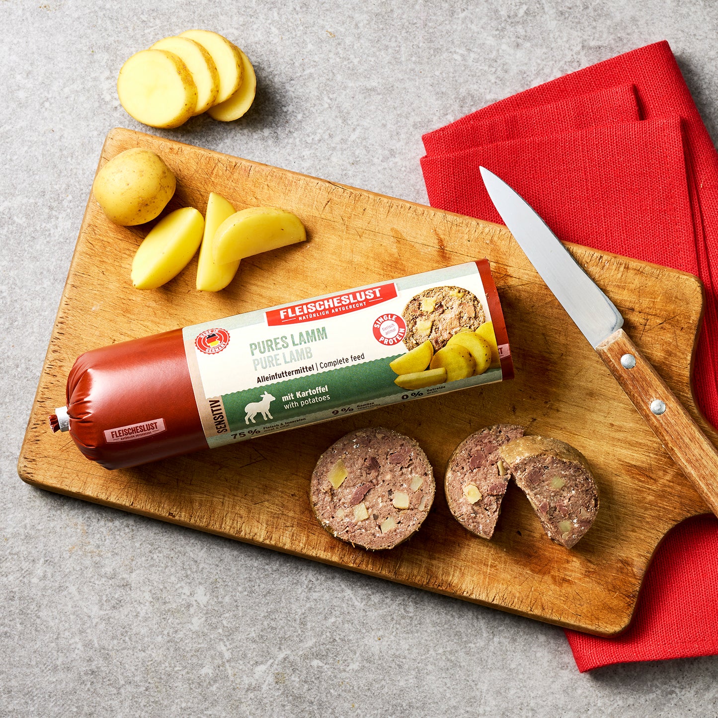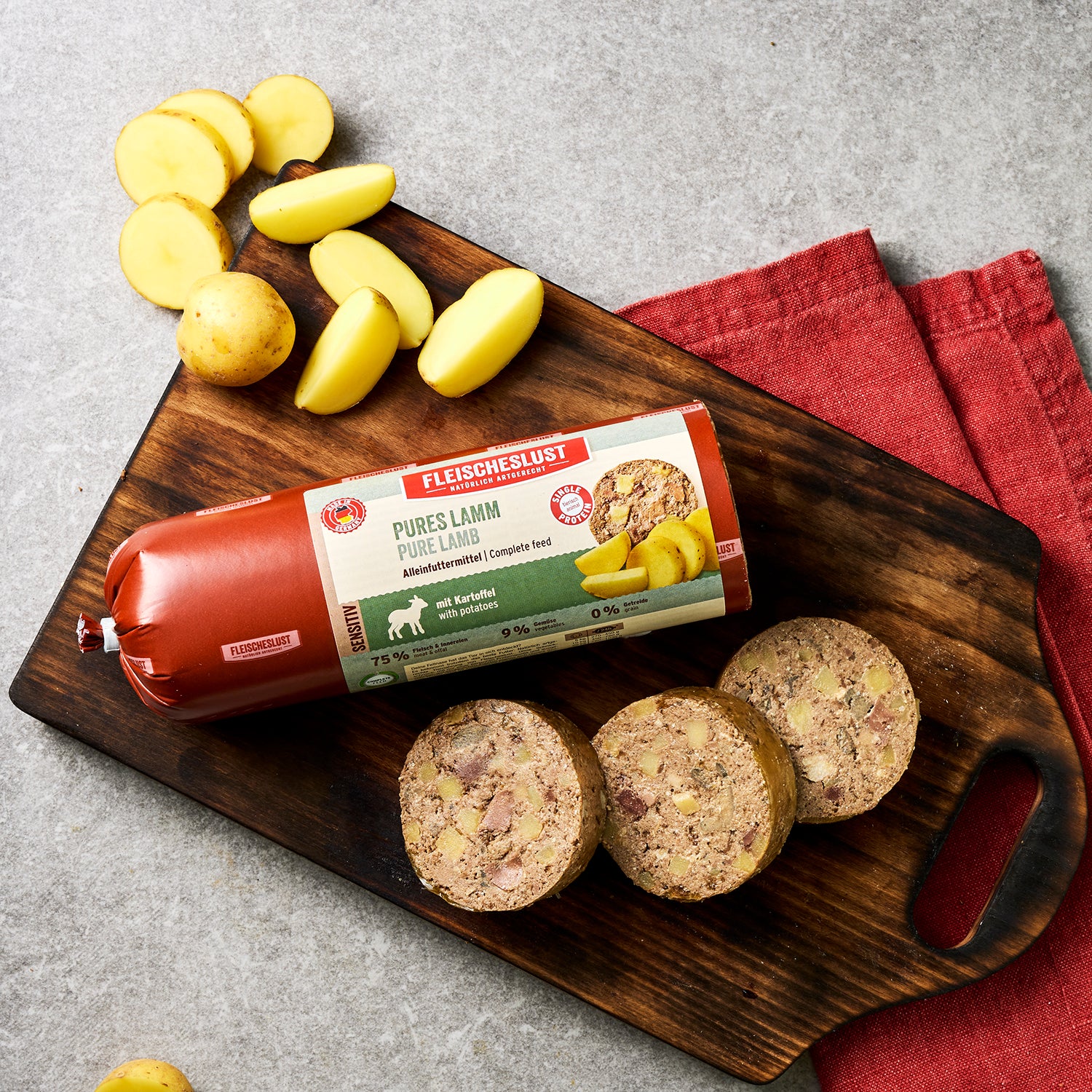 Our Pure Lamb with Potatoes consists of 75% of the finest lamb meat and offal and has only one animal protein source, single carbohydrates and a reduced fat content. The selected, easily digestible ingredients are particularly suitable for nutritionally sensitive dogs. 9 % crisp, fresh vegetables, supplemented with high-quality safflower oil rich in omega-6 fatty acids, make our sensitive complete food menu naturally species-appropriate.