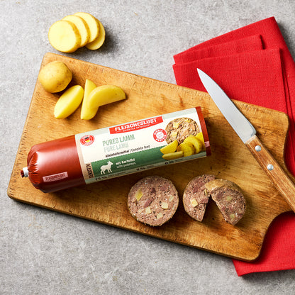 • Our Pure Lamb with Potatoes consists of 75% of the finest lamb meat and offal and has only one animal protein source, single carbohydrates and a reduced fat content. The selected, easily digestible ingredients are particularly suitable for nutritionally sensitive dogs. 9 % crisp, fresh vegetables, supplemented with high-quality safflower oil rich in omega-6 fatty acids, make our sensitive complete food menu naturally species-appropriate.