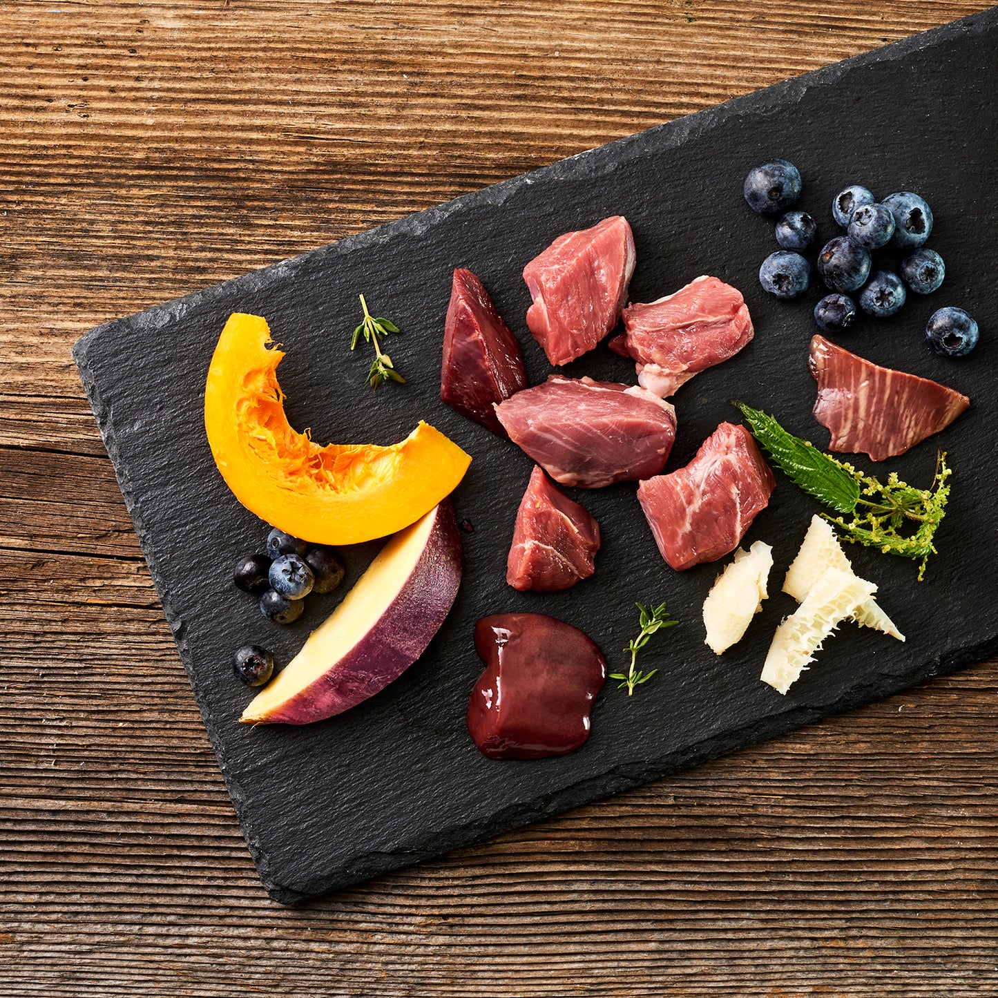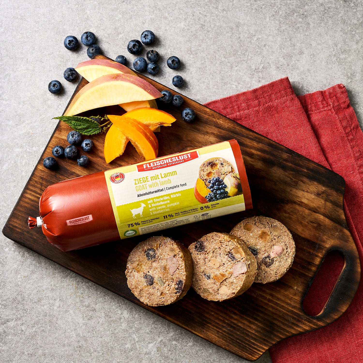 • Our goat with lamb with swede, pumpkin & blueberries consists of 75% finest meat and offal from goat and lamb. 11% delicious fruit, crunchy fresh vegetables and valuable herbs, supplemented with high-quality linseed oil rich in omega-3 fatty acids, make our complete food menu naturally species-appropriate.